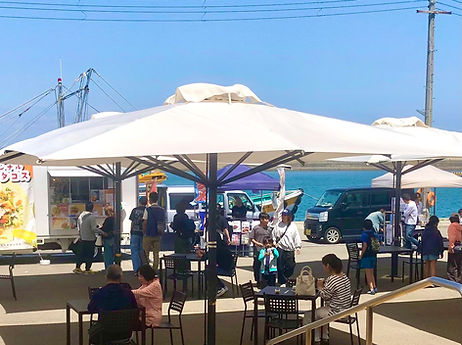 有田市にある箕島漁港直営 浜のうたせで毎月開催している「浜のうたせseaside marche」です。キッチンカーやハンドメイドブースなどが出店して賑わいます。